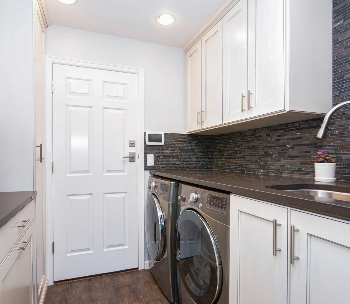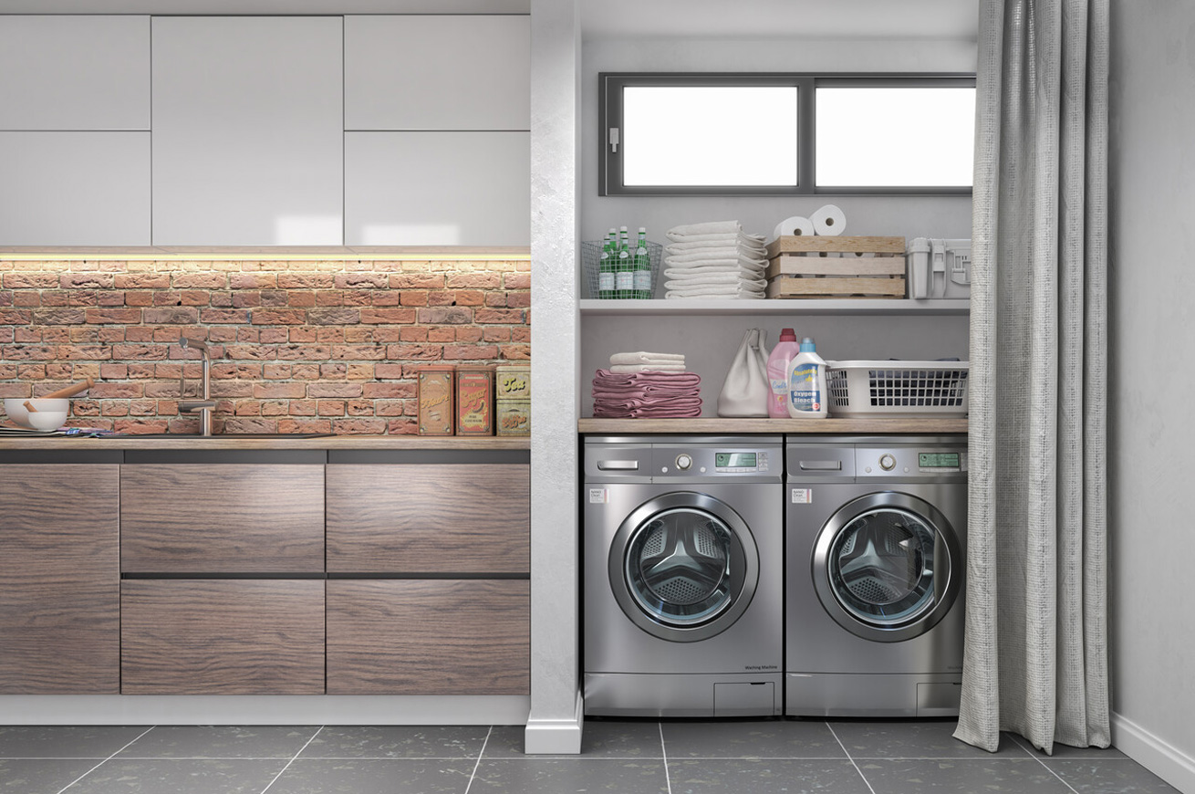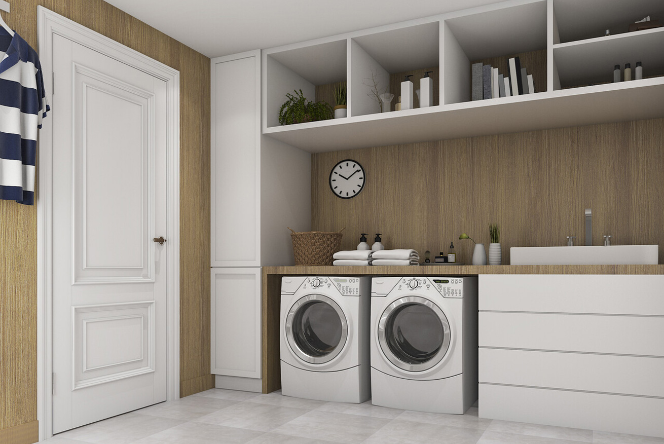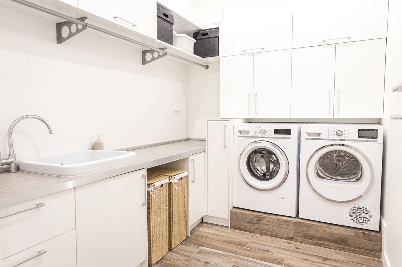 Efficient and stylish storage solutions for laundry supplies and folding space.